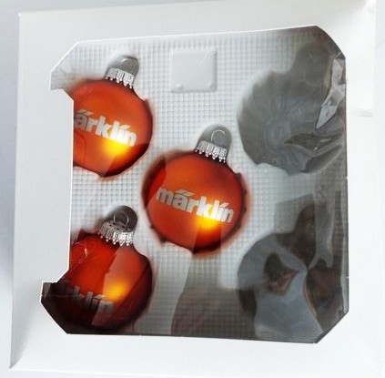 Der Preis gilt für 1 Set = 3 Kugeln orange mit Aufhänger und Aufdruck "märklin", Durchmesser je Kugel ca. 5,5 cm.