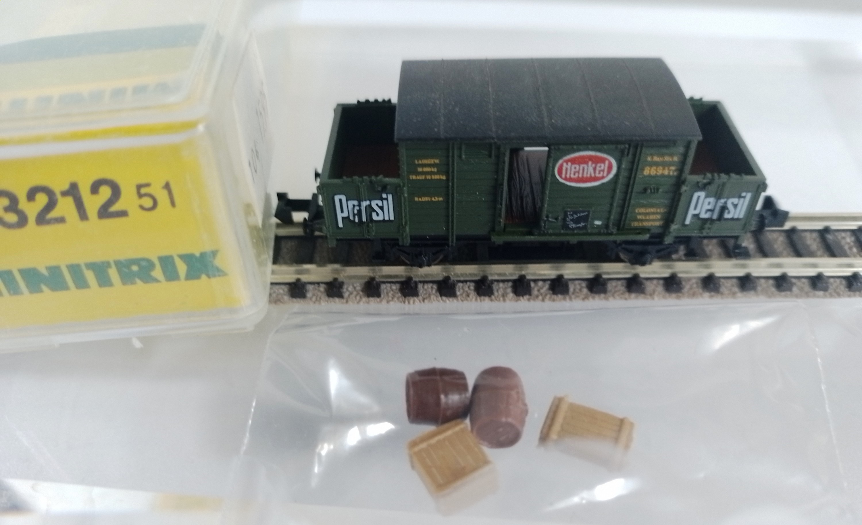 TRIX 13212: N Minitrix Colonialwarenwagen „Persil“ Länderbahn-Bauart, Epoche I. Gebraucht in sehr gutem Zustand. Mit Originalverpackung. 1 Stück.