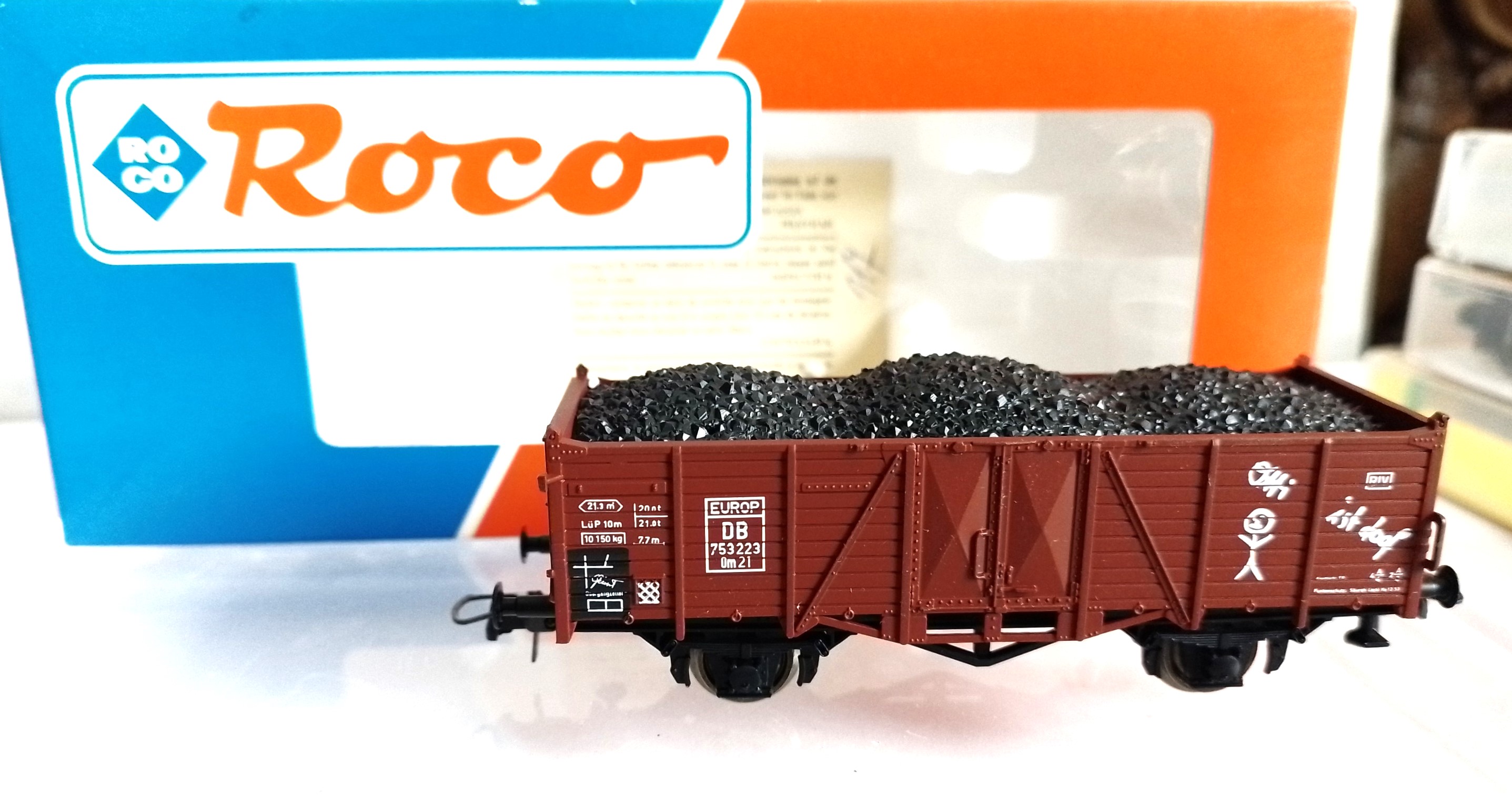 Offener Güterwagen Om 21, Wagennummer 753 223 DB, Ladeguteinsatz aus Kunststoff Kohlenachbildung. Strichmännchen und Aufschrift "Otti ist doof".LüP 106 mm, Kupplungsschacht NEM mit KK-Kulisse.