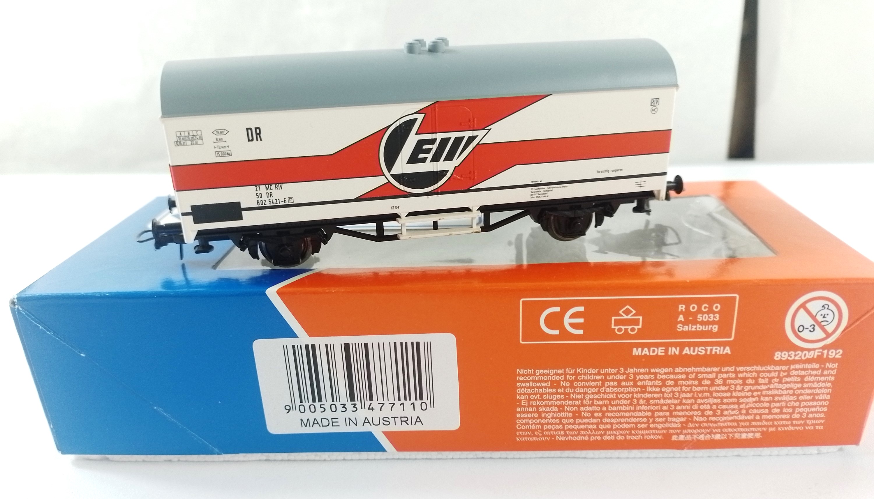 Gedeckter Güterwagen Wagennummer 802 5421-6, Epoche IV DR. Aufschrift "LEW" (Hennigsdorf). LüP 115 mm, Kupplungsaufnahme NEM mit KK-Kulisse. Roco Standard-Bügelkupplungen.