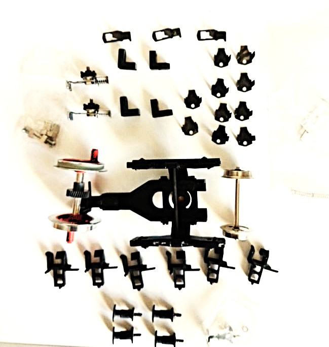 Enthält unter Anderem: 1 Drehgestell Metall (Maxi), 1 Laufradsatz, 1 Treibradsatz, Puffer, Kupplugsbügel, Zusatzschleifer(Stromabnehmehmer), Druckfedern, Abdeckbleche für Kupplungsschacht, Kupplungsadapter für LGB.